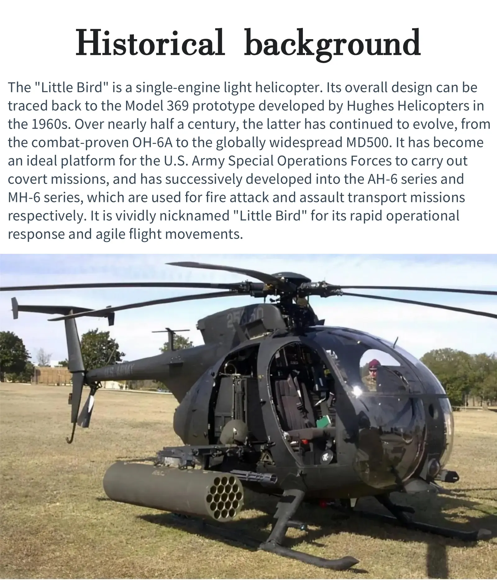 The Hughes/McDonnell Douglas MD500/530 series cil helicopter is a very popular model in the United States and even the international helicopter market, and is considered one of the best multi-purpose helicopters. The MD500/530 “Defender” is a military type developed by the former American Hughes Helicopter Company (incorporated into McDonald Douglas Company on August 27, 1985) based on its MD500/530 civilian helicopter series. Except for “Tao” and “Defender”, its body is the same as the civilian 500/530 type. The US Army numbers 0H-6 “Pony,” AH-6, and MH-6, nicknamed “Little Bird”.