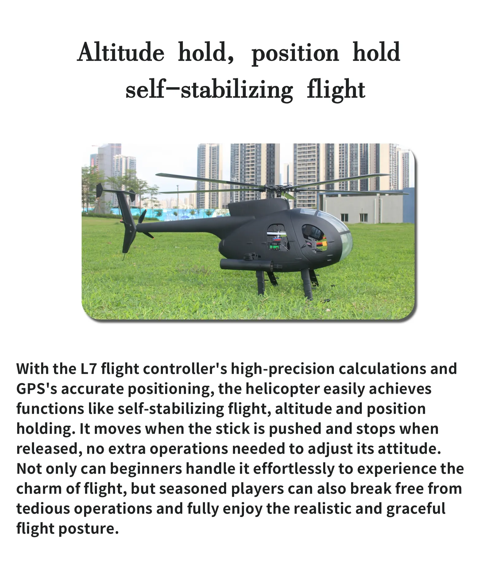 PRECISE CONTROL: The 6CH GPS and L7 flight controller provide precise positioning and stable hovering for this 500 size scale helicopter.